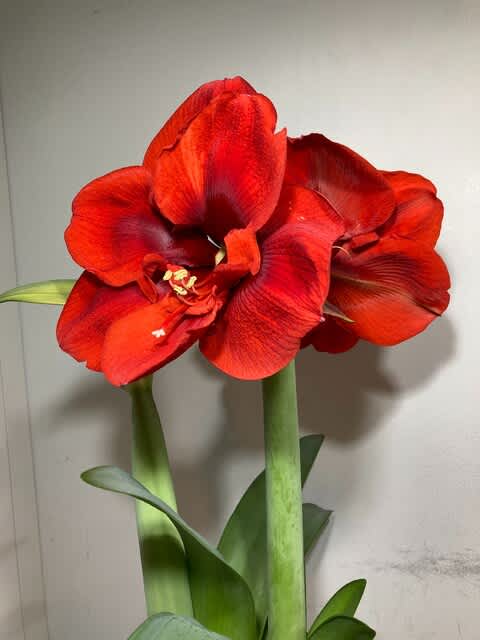 きょう4限も、息子Kさん(受講203回)とアラカンAさん(受講65回)がエレベーターを上がってきて見た途端、「アマリリスというのはこんなに立派な花をつけるんですね~」と驚いていたそうです。