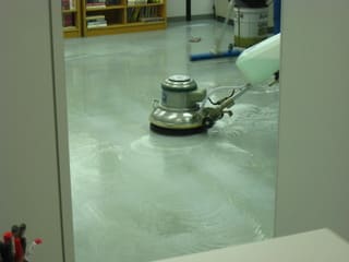 ・机などを片づけ、液材を使用してフロアを磨きます。