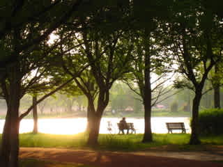 ・新聞を開いている男性に、ジョギングを楽しむ婦人たち。