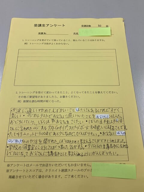 「H君の体験レッスン(入会時)アンケート24/12/8」・「体験感想」ぜんぜんあきずに楽しくできた。・すべてのきょうざいが楽しく、つかれずにできた。・「入会を決めた理由」学校で本をいっぱい読みたいと思って。・学校は本を読む時間が少ないから、そのちょっとした時間にいっぱい本を読んでいきたいから。